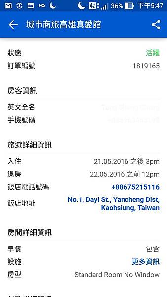 入住房型 : 標準客房(兩大床,無窗),NO.624,含2人早餐